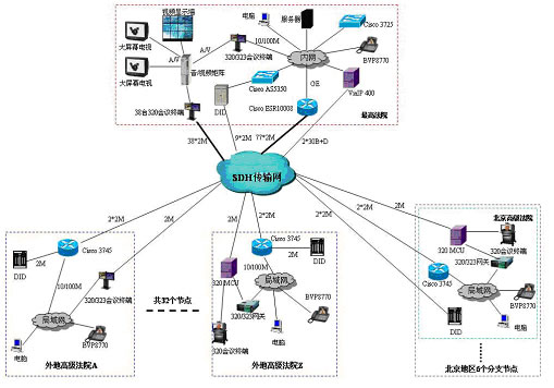 “全国系统一级网”以北京最高××院新办公大楼为核心节点,由全国31个省、市、自治区节点、2个城市节点和5个北京本地节点(共38个分支节点)组成,每个节点通过3条SDH2M电路连接所组成的网络。这些2M电路主要用来在全国各节点之间传输数据、语音和视频,该网络专供××院系统使用。
